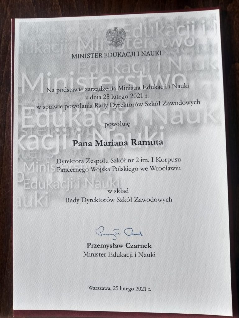 Minister Edukacji i Nauki Przemysław Czarnek  powołał w skład Rady Dyrektorów Szkół Zawodowych Pana Mariana Ramuta Dyrektora Zespołu Szkół nr 2 im. I Korpusu Pancernego Wojska Polskiego we Wrocławiu.