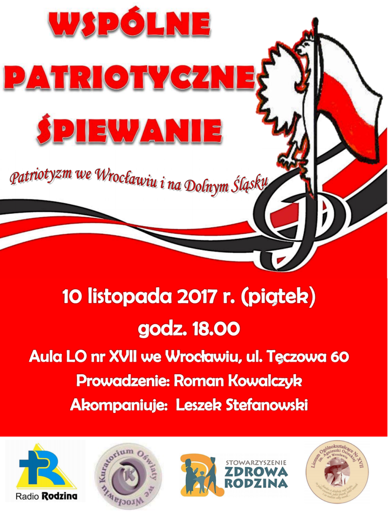 W piątek 10  listopada o godz. 18.00 w auli LO nr XVII im. A. Osieckiej przy ul. Tęczowej 60 we Wrocławiu odbędzie się Patriotyczne Śpiewanie „My Pierwsza Brygada…”. W programie wspólnego śpiewania, które będę miał zaszczyt prowadzić, pieśni i piosenki legionowe, partyzanckie, solidarnościowe. Warto przyjść z rodziną i przyjaciółmi, wstęp wolny.