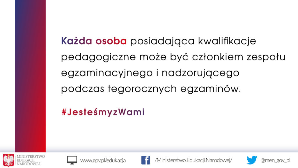 W dniach 10 – 12 kwietnia 2019 r. odbędzie się egzamin gimnazjalny, natomiast w dniach 15 – 17 kwietnia 2019 r. egzamin ósmoklasisty. Zgodnie z przepisami na miesiąc wcześniej w szkołach zostały powołane zespoły nadzorujące przebieg egzaminów. Organizacji egzaminów zagraża akcja protestacyjna pracowników oświaty. Na podstawie zmian do rozporządzeń Ministra Edukacji Narodowej w sprawie szczegółowych warunków i sposobu przeprowadzania egzaminu gimnazjalnego, egzaminu ósmoklasisty oraz egzaminu maturalnego podpisanych 2 kwietnia 2019 r. możliwe jest zaangażowanie w organizację egzaminów osób z zewnątrz posiadających kwalifikacje do zajmowania stanowiska nauczyciela, w tym emerytowanych nauczycieli i nauczycieli akademickich. Chęć udziału w zespole nadzorującym można zgłaszać poprzez formularz zgłoszenia dostępny na stronie internetowej https://edu.kuratorium.wroclaw.pl/egzaminy/ albo bezpośrednio w siedzibie Kuratorium Oświaty we Wrocławiu lub delegaturach znajdujących się pod wskazanymi poniżej adresami: