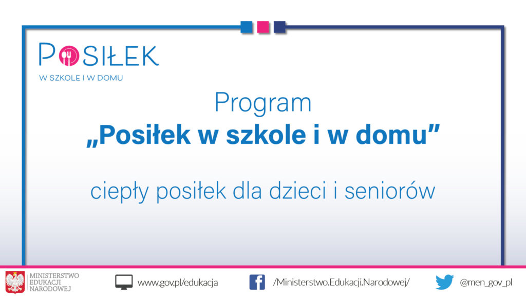 Wieloletni Rządowy Program „Posiłek w szkole i w domu” na lata 2019-2023 został ustanowiony 15 października 2018 r. Oprócz zapewnienia wsparcia finansowego w organizacji stołówek oraz miejsc spożywania posiłków w szkołach, tzw. jadalni, Program przewiduje wsparcie finansowe gmin w udzieleniu pomocy w formie posiłku, świadczenia pieniężnego w postaci zasiłku celowego na zakup posiłku lub żywności oraz świadczenia rzeczowego w postaci produktów żywnościowych.