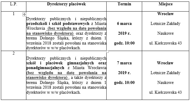 Zaproszenie kierowane jest do wszystkich dyrektorów przedszkoli, szkół i placówek publicznych i niepublicznych Miasta Wrocławia (bez względu na datę powołania na stanowisko dyrektora) oraz do tych dyrektorów z terenu Dolnego Śląska, którzy zostali powołani na stanowiska z dniem 1 września 2018.
