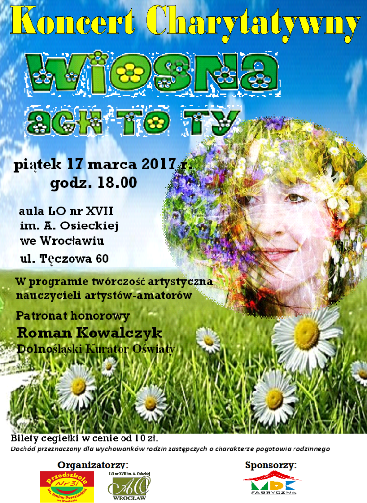 serdecznie zapraszam na Koncert Charytatywny pt. „Wiosna, ach to ty!”, który odbędzie się w piątek 17 marca 2017 roku o godz. 18.00  w auli Liceum Ogólnokształcącego nr XVII im. Agnieszki Osieckiej przy  ul. Tęczowej 60. W programie twórczość artystów amatorów nauczycieli wrocławskich placówek edukacyjnych (m.in. piosenki, wiersze, scenki, fotografie, prace plastyczne). Będzie można nabyć ozdoby wielkanocne przygotowane przez wrocławskie przedszkola. Po koncercie organizatorzy, Przedszkole nr 31 im. Janiny Porazińskiej oraz Liceum Ogólnokształcące nr XVII im. Agnieszki Osieckiej, zapraszają na miłe pogawędki, kawę, herbatę i pyszne ciastko.
