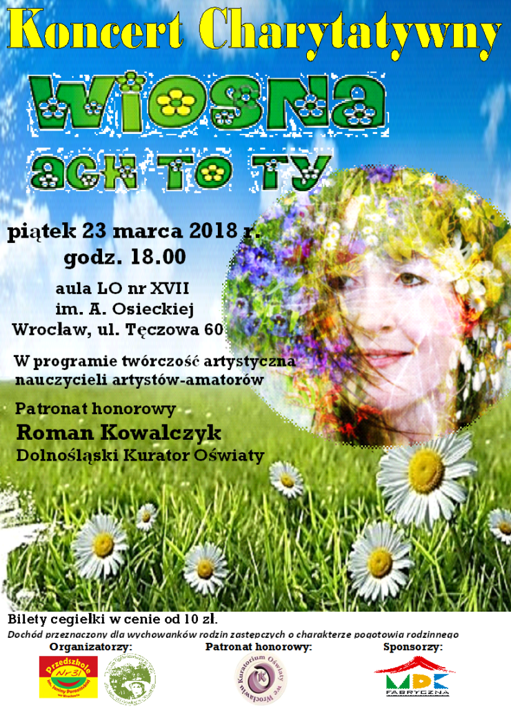 23 marca 2018 r. o godzinie 18:00 w auli LO Nr XVII im. A. Osieckiej odbędzie się Charytatywny Koncert „Wiosna, ach to Ty!”. Na scenie wystąpią pracownicy wrocławskich placówek edukacyjnych śpiewając piosenki, deklamując wiersze, prezentując twórczość własną i nie tylko.