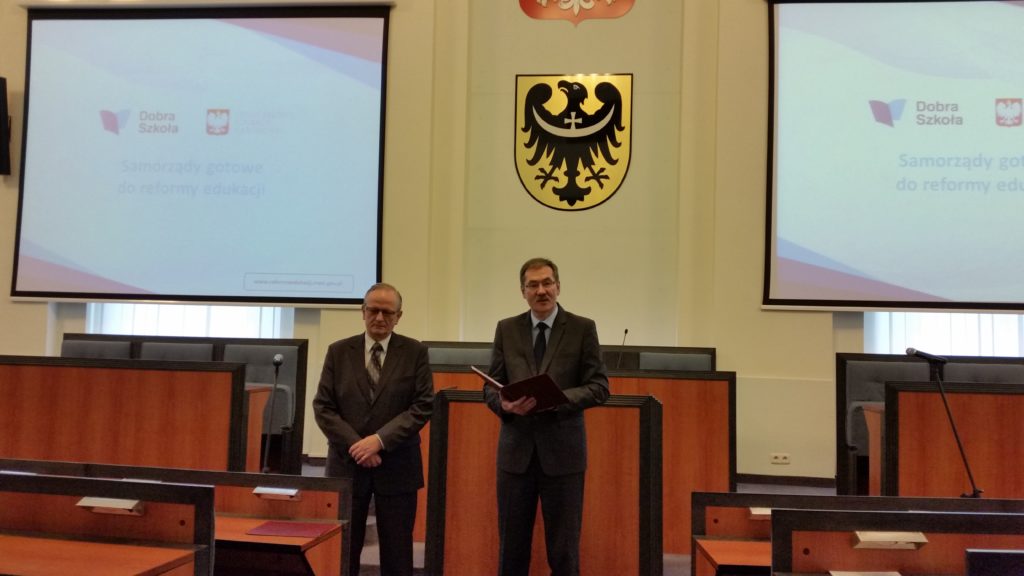 Roman Kowalczyk Dolnośląski Kurator Oświaty i Janusz Wrzal Dolnośląski Wicekurator Oświaty wzięli dziś udział w konferencji prasowej. Jest to kolejne spotkanie informacyjne z przedstawicielami mediów nt. prac nad wdrażaniem reformy oświaty.