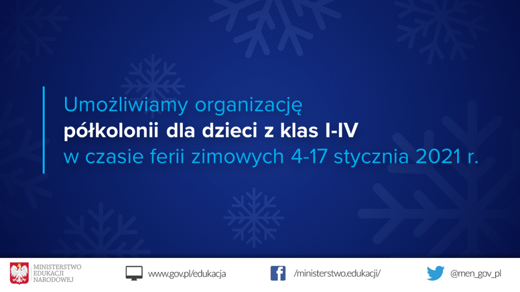 W czasie tegorocznych ferii zimowych, które dla wszystkich w tym roku wyjątkowo odbędą się w jednym terminie 4 – 17 stycznia 2021 r., w szkołach i placówkach oświatowych będzie można organizować wypoczynek w formie półkolonii dla uczniów klas I-IV szkoły podstawowej. To odpowiedź na prośby rodziców i organizatorów półkolonii, którym dajemy możliwość, aby w ścisłym reżimie sanitarnym zorganizować opiekę dla najmłodszych dzieci.