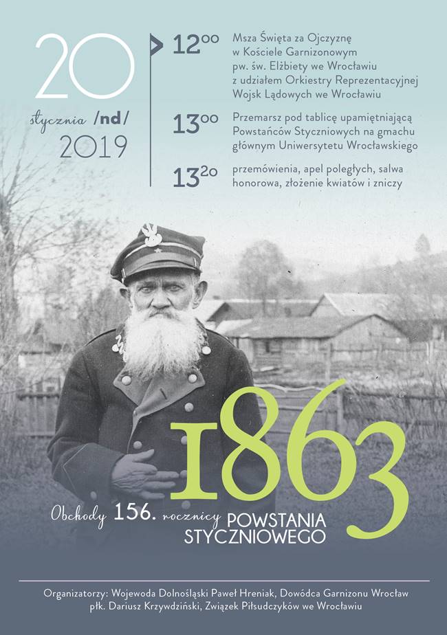 w związku ze zbliżającymi się obchodami rocznicy wybuchu Powstania Styczniowego Wojewoda Dolnośląski, Dowódca Garnizonu Wrocław i Związek Piłsudczyków Oddział Wrocław zapraszają na Mszę świętą w intencji uczestników powstania, która odbędzie się w Kościele Garnizonowym pw. św. Elżbiety w dniu 20 stycznia 2019 r. (niedziela) o godz. 12.00.