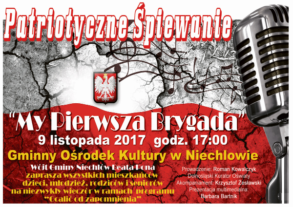 9 listopada w związku ze zbliżającym się Narodowym Świętem Niepodległości Roman Kowalczyk Dolnośląski Kurator Oświaty uczestniczył w koncercie Patriotyczne Śpiewanie „My, Pierwsza Brygada”, który odbył się w Gminnym Ośrodku Kultury w Niechlowie. Na fortepianie grał Krzysztof Żesławski, prezentację multimedialną przygotowała Barbara Bartnik.