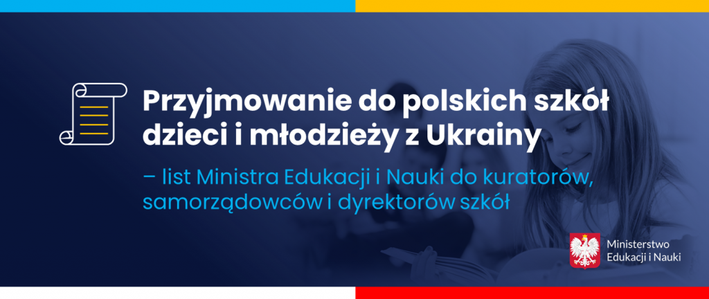 Pełna informacja na stronie MEiN: https://www.gov.pl/web/edukacja-i-nauka/przyjmowanie-do-polskich-szkol-dzieci-i-mlodziezy-z-ukrainy–list-ministra-edukacji-i-nauki-do-kuratorow-samorzadowcow-i-dyrektorow-szkol