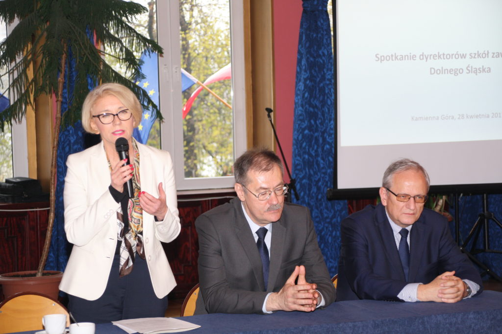 W dniu 28 kwietnia br. w Liceum Ogólnokształcącym w Kamiennej Górze odbyło się spotkanie dyrektorów dolnośląskich szkół zawodowych z Sekretarzem Stanu w Ministerstwie Edukacji Narodowej panią Marzeną Machałek. W trakcie spotkania, prowadzonego przez pana Romana Kowalczyka, Dolnośląskiego Kuratora Oświaty, pani Marzena Machałek przedstawiła stan dotychczasowych prac nad reformą szkolnictwa zawodowego oraz kierunki dalszych zmian. Przedstawiła też cel spotkania – włączenie dyrektorów szkół do dyskusji na ten temat. Zachęciła tym samym dyrektorów do wypowiedzi w dalszej części spotkania. Dolnośląski Wicekurator Oświaty Janusz Wrzal przedstawił w liczbach stan szkolnictwa zawodowego na Dolnym Śląsku oraz skróconą analizę wyników egzaminów zewnętrznych.