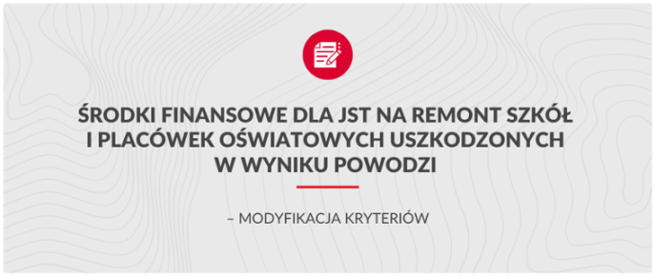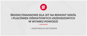 Jednostki samorządu terytorialnego na terenie objętym stanem klęski żywiołowej mogą do 8 listopada składać wnioski o środki na remont i wyposażenie szkół i placówek zniszczonych w powodzi. Dzięki rozwiązaniom wprowadzonym przez rząd w tzw. specustawie istnieje możliwość finasowania z rezerwy uszkodzonego lub zniszczonego wyposażenia przedszkoli publicznych.