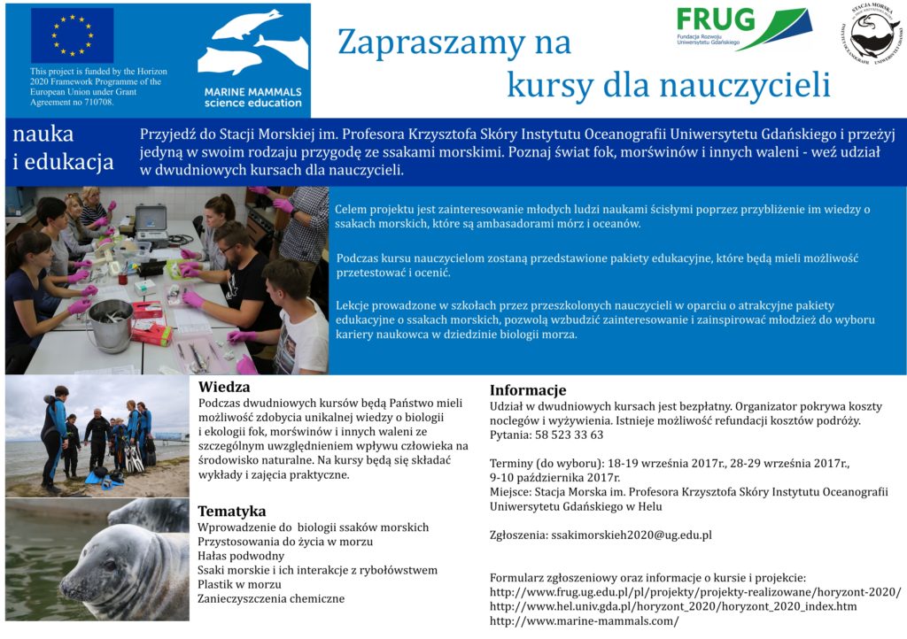 Fundacja Rozwoju Uniwersytetu Gdańskiego oraz Stacja Morska im. Profesora Krzysztofa Skóry w Helu zapraszają Państwa – nauczycieli przedmiotów przyrodniczych na bezpłatny 2-dniowy kurs szkoleniowy w zakresie biologii i ekologii ssaków morskich „Ssaki morskie – nauka i edukacja”. Kurs organizowany jest w ramach projektu „Using marine mammals for making science education and science careers attractive for young people – MARINE MAMMALS”, programu finansowania badań naukowych i innowacji Unii Europejskiej HORYZONT 2020.