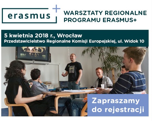 Zachęcamy Państwa Dyrektorów i Nauczycieli dolnośląskich szkół i placówek do udziału w Warsztatach Regionalnych Programu Erasmus +, organizowanych  5 kwietnia 2018 r. w Przedstawicielstwie Regionalnym Komisji Europejskiej we Wrocławiu (Dom Europy, ul. Widok 10), przez Fundację Rozwoju Systemu Edukacji. Podczas warsztatów będzie okazja do pozyskania wiedzy na temat zasad uczestnictwa w Programie Erasmus + oraz wymagań związanych ze stworzeniem projektu edukacyjnego. Zaplanowano również prezentację przykładów zrealizowanych projektów z sektorów: Edukacja szkolna, Kształcenie i szkolenie zawodowe, Młodzież, Edukacja dorosłych.