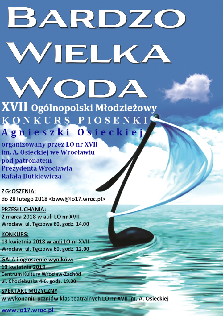 Liceum Ogólnokształcące nr XVII im. Agnieszki Osieckiej we Wrocławiu zaprasza uczniów VII klasy szkoły podstawowej, gimnazjum i szkół ponadgimnazjalnych do udziału w XVII Ogólnopolskim Młodzieżowym Konkursie Piosenki Agnieszki Osieckiej „Bardzo Wielka Woda – 2018”