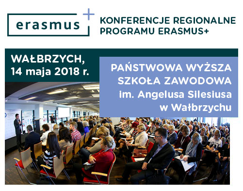 14 maja 2018 r. w Państwowej Wyższej Szkole Zawodowej im. Angelusa Silesiusa w Wałbrzychu odbędzie się Konferencja Regionalna Programu Erasmus +, organizowana przez Fundację Rozwoju Systemu Edukacji, przeznaczona dla dyrektorów szkół i placówek, nauczycieli, przedstawicieli organów prowadzących zainteresowanych pozyskiwaniem funduszy unijnych.