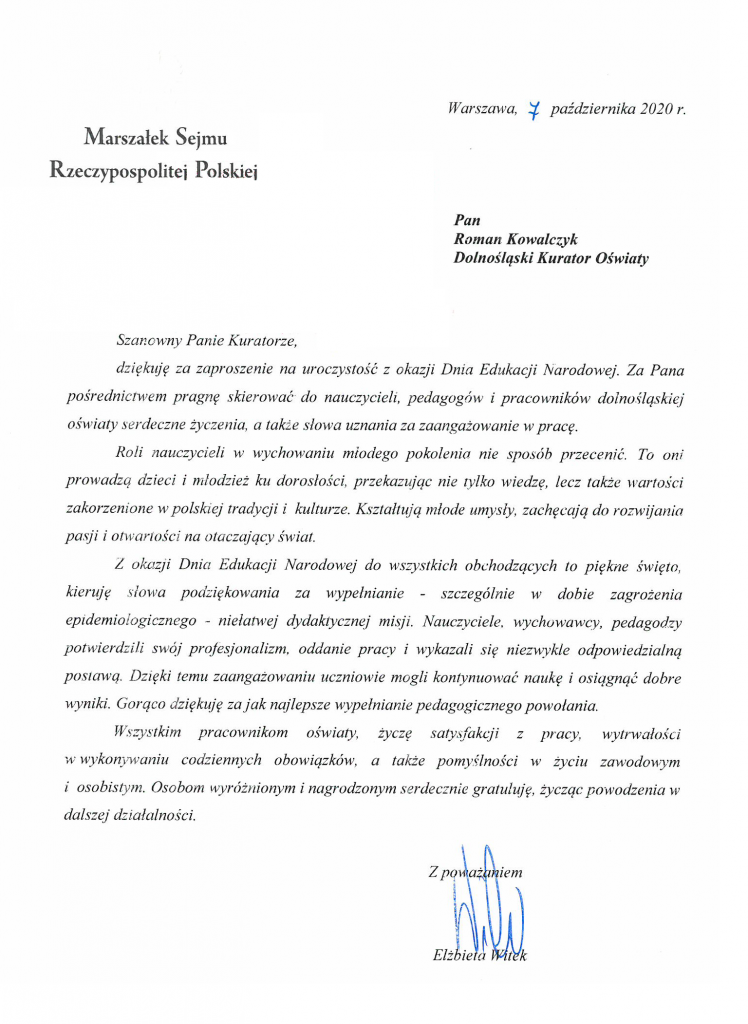 Życzenia Marszałek Sejmu Rzeczpospolitej Polskiej z okazji Dnia Edukacji Narodowej